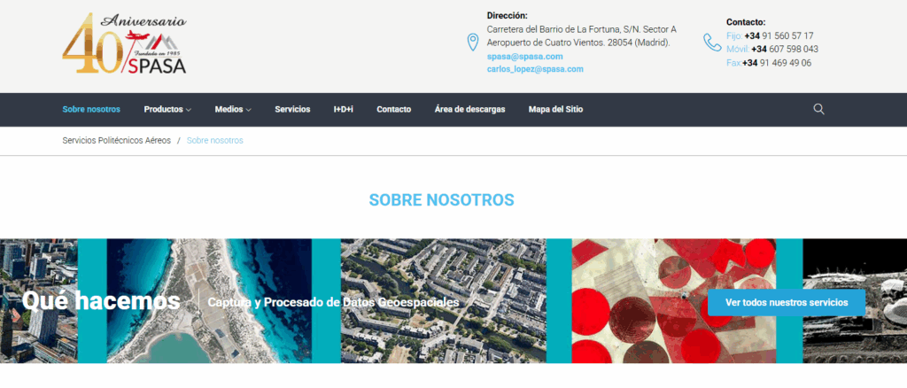 SPASA es una compañía en expansión de ámbito internacional dedicada a la captura y tratamiento de datos geoespaciales adquiridos desde cualquier tipo de plataforma aerotransportada. Para ello, dispone de la Autorización de la Agencia Estatal de Seguridad Aérea (AESA) que la acredita como empresa operadora de trabajos aéreos y de los medios más avanzados del mercado, clasificados en medios aéreos, donde englobamos las diferentes plataformas de vuelo sobre las que operamos (aviones, helicópteros, RPAS, etc.); los sensores, siempre a la vanguardia de la tecnología, empleando cámaras digitales de alta resolución (Ultracam Eagle, Falcon, Xp, X, Phase One, RCD-30), sensores LiDAR de última generación (ALS80, RIEGLVQ-580 II), sensores térmicos y multiespectrales; y nuestro equipo humano, cuya profesionalidad, formación y experiencia ha convertido a SPASA en una empresa de referencia en términos de calidad dentro del sector.